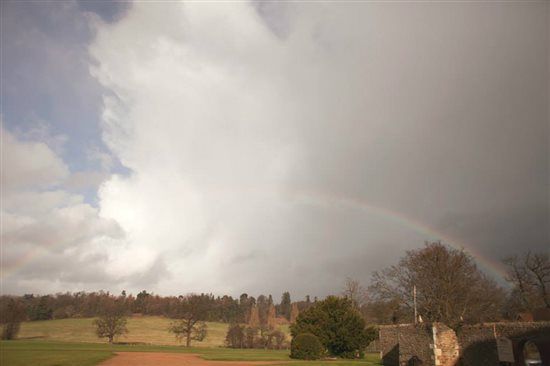 as we pulled up to the grounds of the venue, the driver stopped again and gave daddy and i a glass of champers. then he drove on to the gounds and finally up the drive. he took me over to the barn and i got out and went in to meet up with MOH, BM, mini miss winter and i expected mini mr winter but he was over in the house. i had a few mins to catch my breath and calm when one of my ushers came over and said we were ready and i needed to come over. maids headed to the house and i got back in the car. driver took me over and as we were driving i noticed a rainbow in the sky so i phoned MOH again and asked her to get the tog to grab a pic of it- how many brides get a rainbow on their wedding day??? lol
