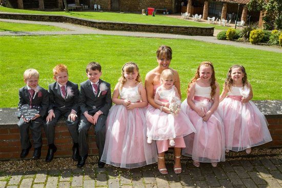 The journey to the venue took around 20 minutes. S, Best woman and the 3 older flower girls travelled in one van and I travelled with dad and my 3 boys. Traffic flow around town is always heavy on a Saturday, even more so on a sunny weekend when you have to pass several retails parks (think first day of summer and heading to B&Q!), horns tooted and people waved and cheered as we passed. Dad and I enjoyed a bottle of champagne and while the boys enjoyed feeling like celebrities. The sun beamed through the windows, the Beach Boys sang away in the background and we just soaked it all up. We pulled into the long driveway of the venue to spot that the girls' van had pulled up and the venue co-ordinator came running over signalling for us to back up slightly as all my guests were still milling around in the outside bar area in the sunshine and groom was just finishing with the registrar. I could see familiar figures down on the lawn and the TOG running towards me. This was the only point in the day that I felt mildly nervous. I hadn't spoken to him since I'd threatened to sack him two weeks before but he simply threw open the doors to the van and started snapping away, fussing over the boys, telling me I looked amazing, how beautiful the venue looked, how handsome the boys were.... everything was going to be fine. I see the girls get out of the van and the signal is given that the coast is clear for me to go in to see the registrar. The champagne has caused a bit of a haze but S leads all the children (she has 7 of them to cope with alone!) as dad and I go inside. From the moment we meet the registrar I know this will be no ordinary ceremony. The woman is hilarious. Stand-up comedy hilarious. First thing she asks is if my dad is a true Scotsman. I beg him not to prove it. She then asks the usual questions but as she asks if I am entering into the marriage of my own free will and did I not want to have a think as she's seen some good looking single men going in. She then puts on a very straight and stern face and says "now, the most important question. Where on earth did you get that amazing bouquet??!". She wishes me luck and leaves to go down to the high barn and the co-ordinator leads us outside to where the rest of the bridal party are playing in the sunshine. The photographer is there and some more pictures are taken
