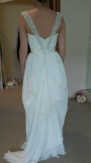 Please excuse the pins they won't be there on the day, and they were showing me how to bustle the dress which is why it is done up. Only little wobble is I look bigger from the front than the back hoping it's just the angle of the photo and that ever so flattering fluorescent lighting.