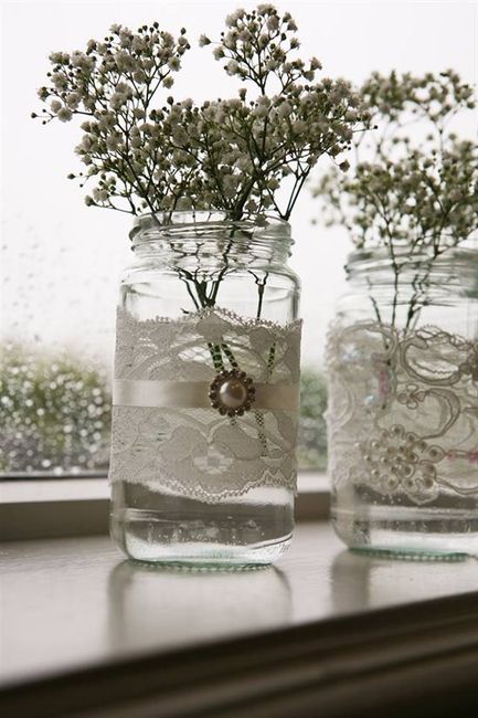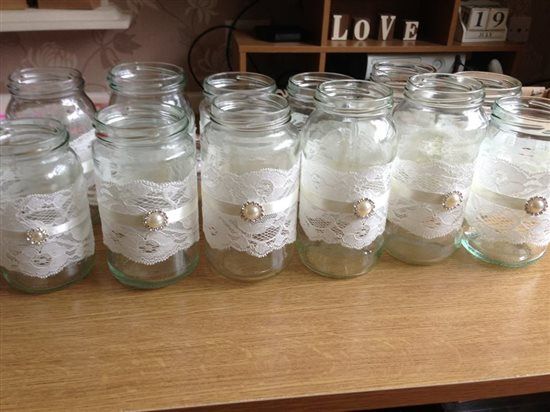 Lots of jars wrapped in lace, ribbon with pearl. Would have to be collected, if interested I can count how many I have and sort a price