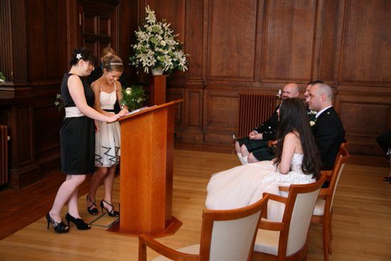 The ride in the car was horrible,i could not really speak and was so anxious. When i got the the registry office the lady who would marry us was waiting for me at the door,she was so nice and did her best to put me at ease,i was a bit of a wreck walking down the aisle though. My daughters read out "a very lovely love story" and burst out laughing at the end as they did not want to say the last line "and the world is a beautiful place"..to cheesy apparently. My son had been running about wild but was pretty good for the ceremony..he is the gorgeous wee boy in the kilt. The vows also made me nervous and i got my new husbands name the wrong way round which everyone laughed at. The minute we were married i relaxed..and stayed relaxed for the rest of the day.
