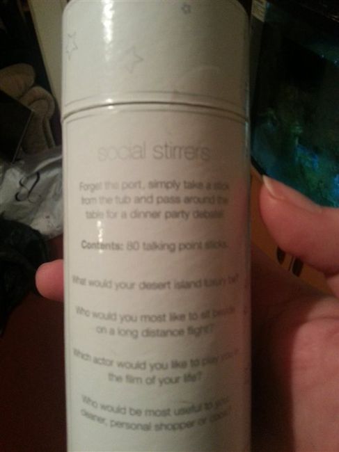 Each tub contains 80 sticks with talking points on to get your guests from both sides talking at the dinner table!