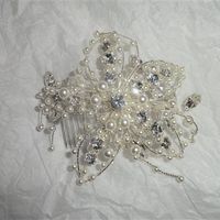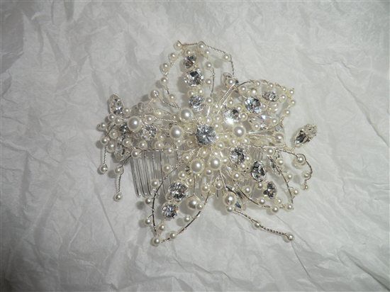 Hi, I am selling a gorgeous silver coloured headpiece (suitable for brides, bridesmaids etc) flower shaped (five pointed petals) on a silver coloured comb. It is about 4.5 inches across. There are different sized pearls all over as well as oval and...