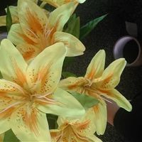 5Satin lily bunch in yellow and lilac each bunch has 12 heads and are mounted on green wire stems. £3 each bunch. I used these to make my bouquets i clipped each flower off the bunch and they inserted...