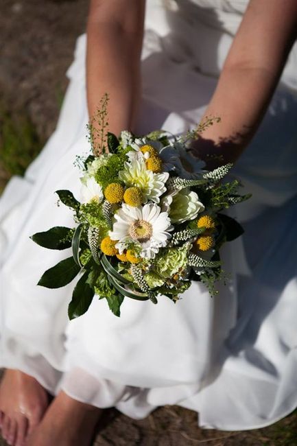 I found this picture online and it fits my colour scheme perfectly. I want to keep it simple white gerbera or daisies, but have no clue what the green flowers are. I think it's two types. Can anyone help? Also, would they be available in July from...