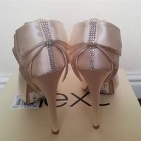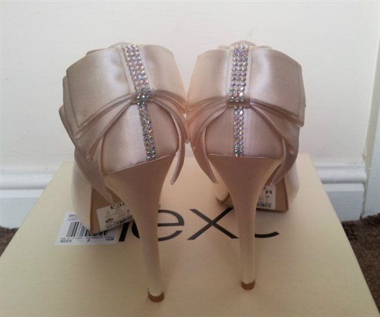 Brand new Ivory Satin Bow shoe, boxed, still with stickers, size 4. heel height 10 cm. Customized with swarovski crystals, looking for £50 inc postage. they look a diff shade in the pics, but they are...
