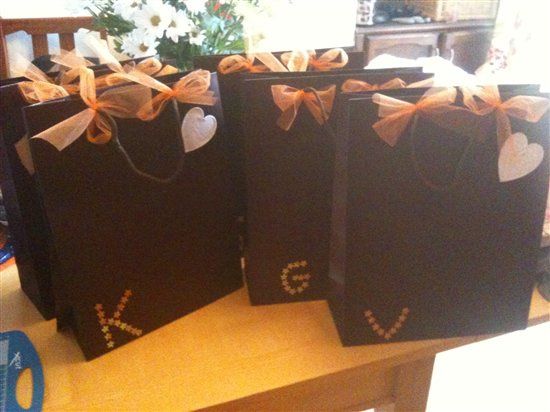 Not long ago I saw flashes of some lovely gift bags that someone had done for their bridesmaids. I think they were dark brown and they had the bridesmaid initials on them in crystals. Well I'm not afraid to steal a good idea so I'm looking for all...