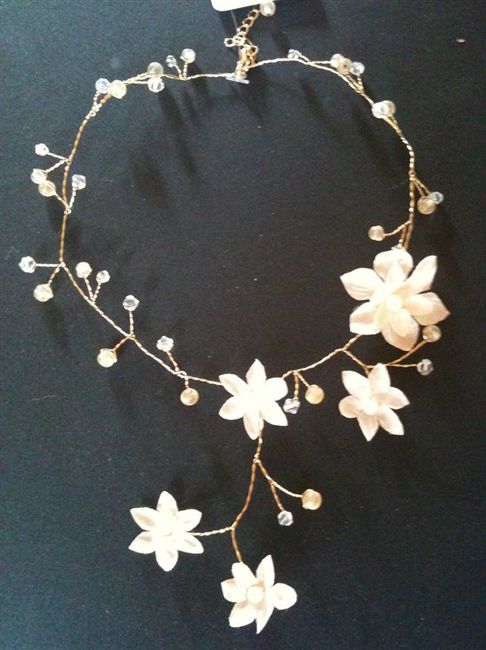 I bought this necklace from France this week, it's just perfect, I can't wait to try it on with my dress. The picture is not very clear but inside each flower there is a pearl. I didn't find matching earrings, but I will keep looking!