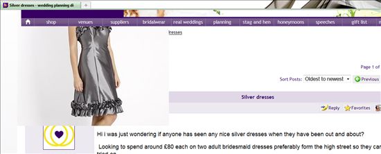 Hi i was just wondering if anyone has seen any nice silver dresses when they have been out and about? Looking to spend around £80 each on two adult bridesmaid dresses preferably form the high street so they can be tried on. Am not looking...
