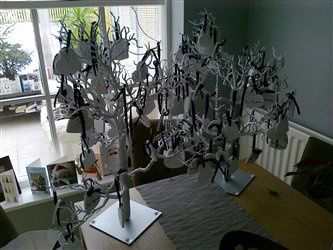 Hi I have a silver tree that I used as a 'wish tree' for our guests to write their messages on during the evening reception. I also have a box of spare white wooden hearts with white and silver ribbon to hang on the tree. I also hung glass icicles...