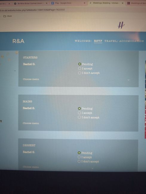 I'm trying to add a menu to our wedding website and we have a choice of 2 starters, 2 mains and 2 puddings. All guests are attending all day. How do I go about setting this up under 1 heading Eg Attendance - pending, I accept, I don't accept Starter...