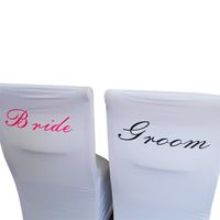 I have Bride and Groom x2 White stretchy Chair Covers Bride Text in Pink Grooms Text in Black. ALL NEW