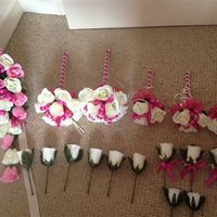 Included is; brides teardrop bouquet 2 adult bouquets 3 flower girl wands 2 page boy button holes 3 female corsages 6 buttonholes